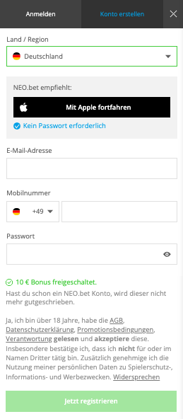Registriere dich in nur 2 Minuten bei NEO.bet. Dein gratis Wettguthaben wird nach er Registrierung automatisch auf Deinem Wettkonto gutgeschrieben