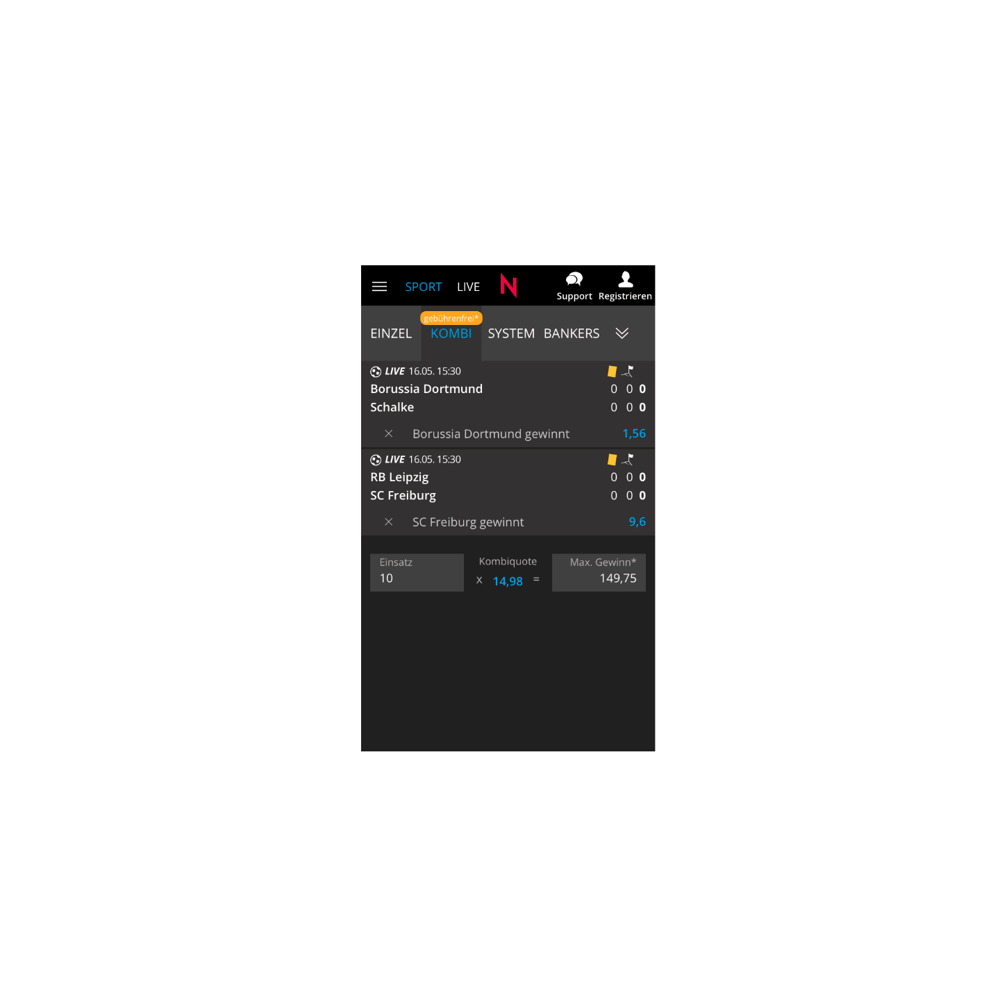 Um die Gesamtquote errechnen zu können, werden alle Quoten miteinander multipliziert (1,56 x 9,6), sodass sich am Ende die Gesamtquote von 14,98 ergibt. Mit einem niedrigen Einsatz von lediglich 10,00 € würde dir also im Erfolgsfall ein Erlös von 149,80 € auf das Wettkonto überwiesen werden.