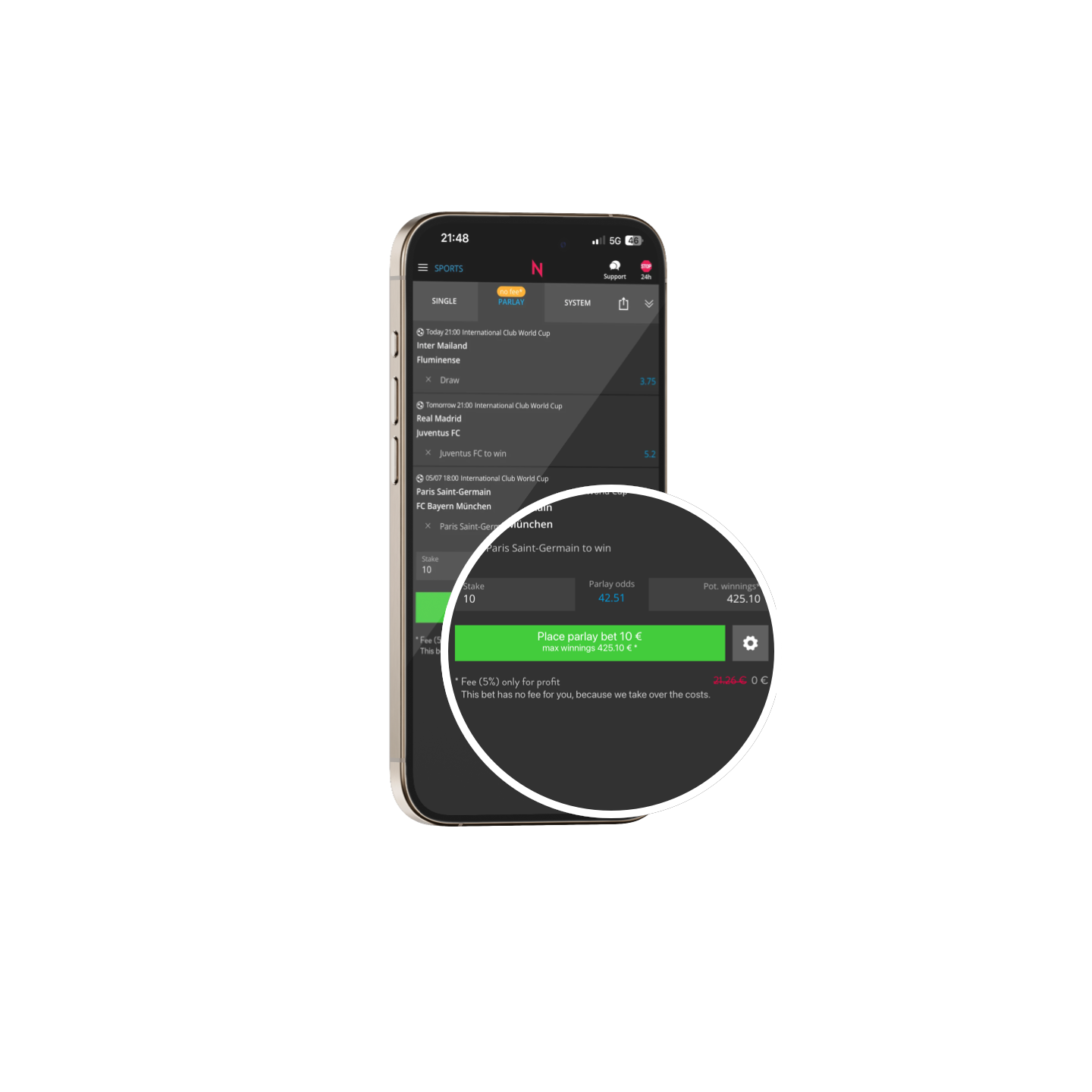 WITHOUT fees: Stake 10 € x 42,51 = 425,10€