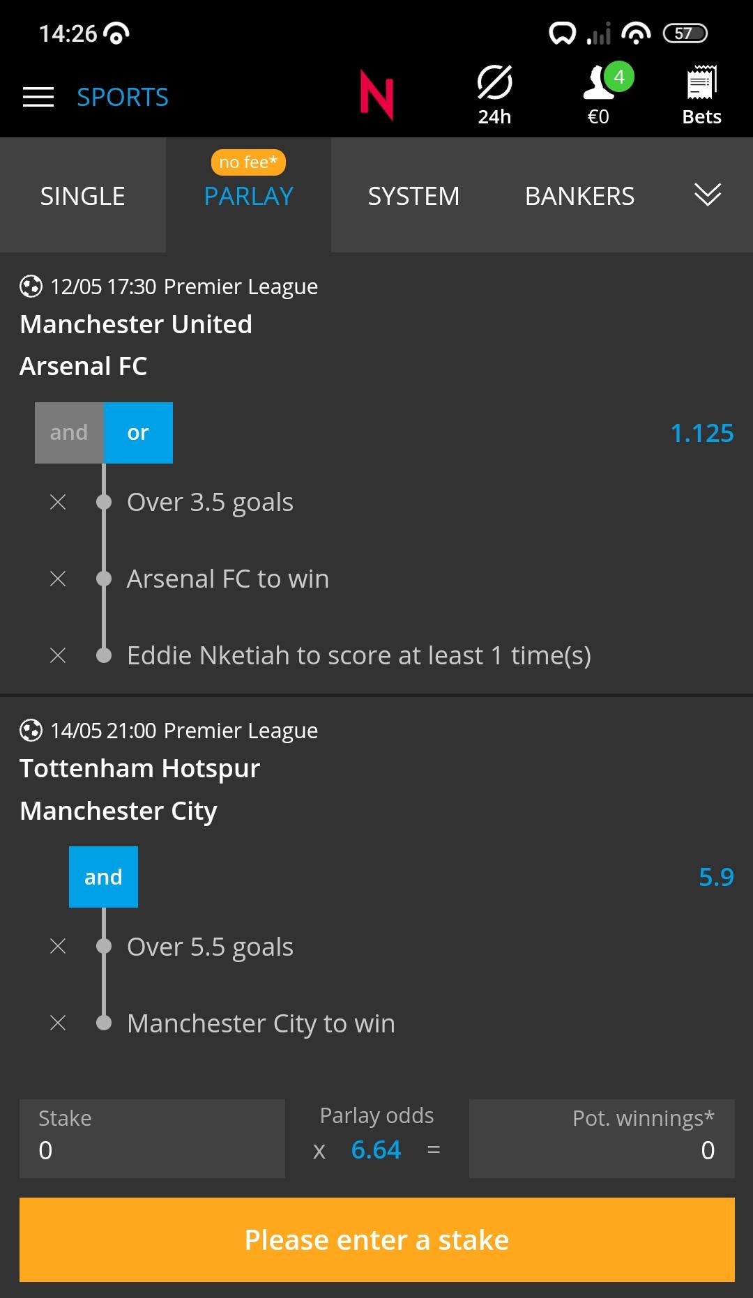 With the AND combiner you increase your profit with smaller stakes. For example, bet on a home team win AND that over 1.5 goals are scored.