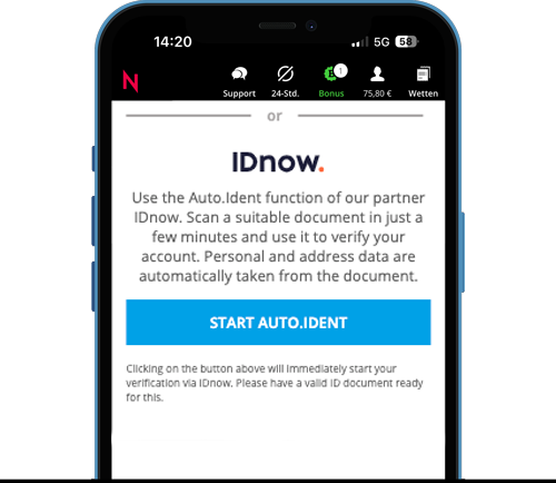 Alternatively, you can also verify your betting account conveniently in under 5 minutes using IDnow.
